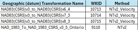 This table lists all the transformations based on the new NTv2 velocity grid approach in Pro 3.6